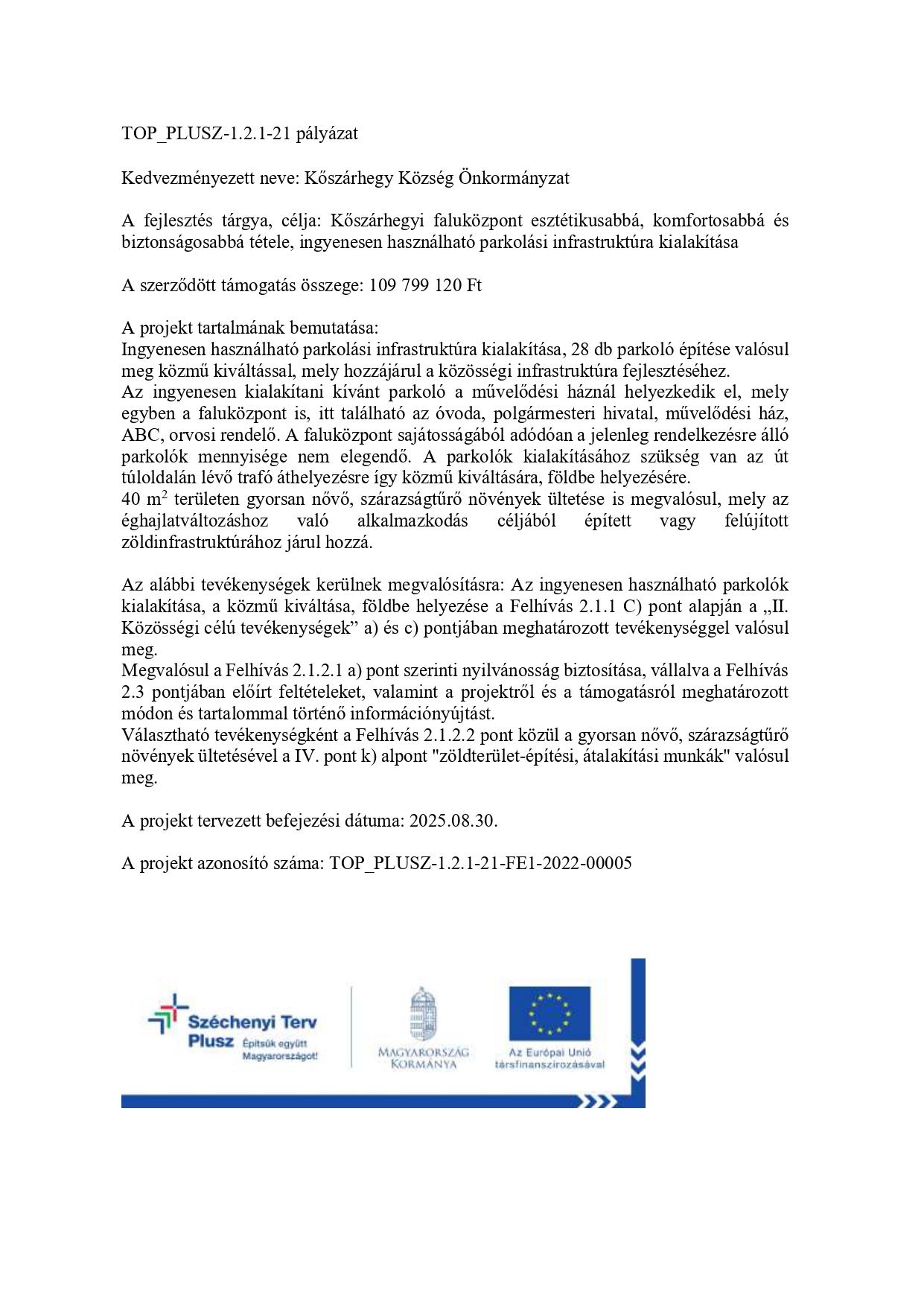 Kőszárhegyi faluközpont esztétikusabbá, komfortosabbá és biztonságosabbá tétele, ingyenesen használható parkolási infrastruktúra kialakítása